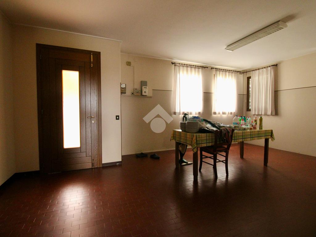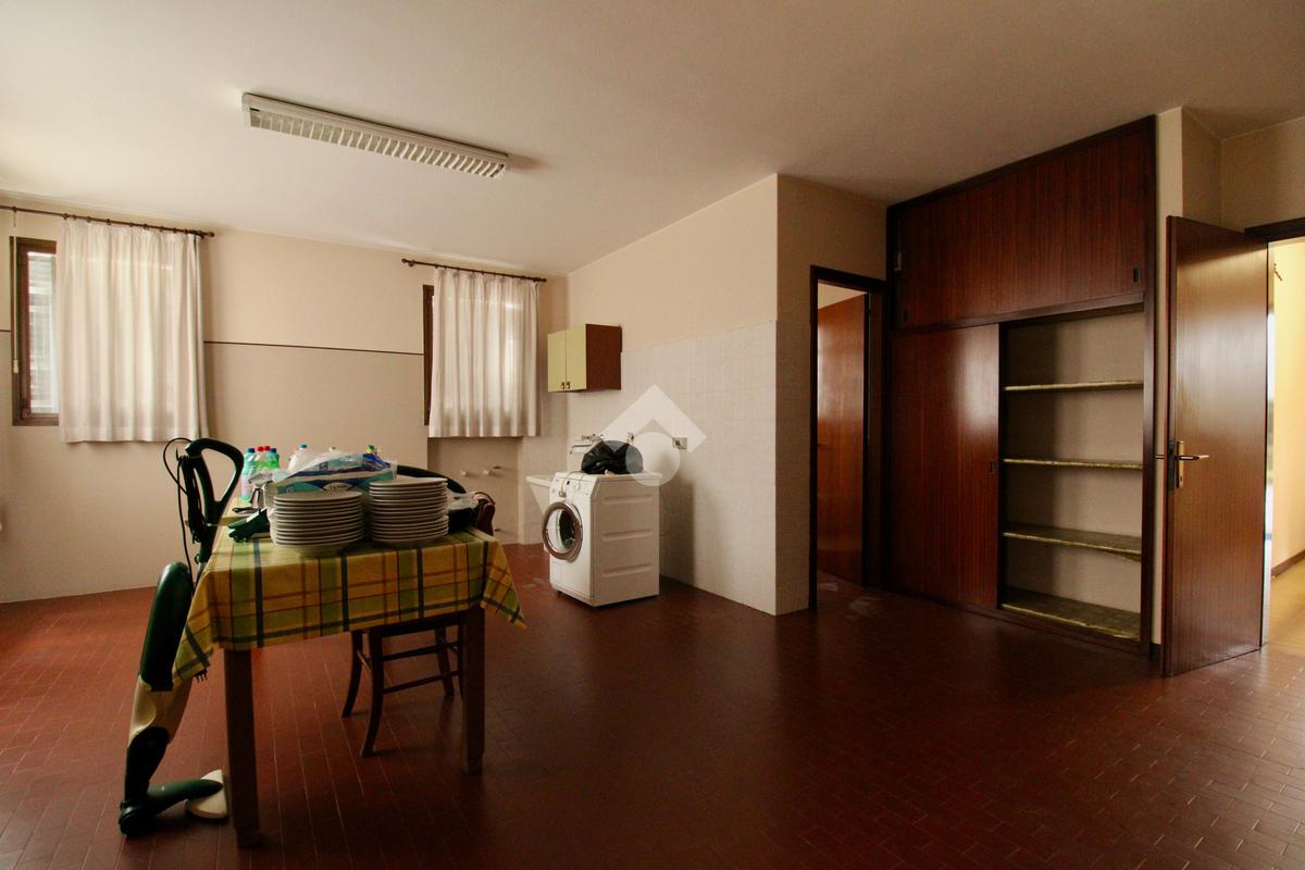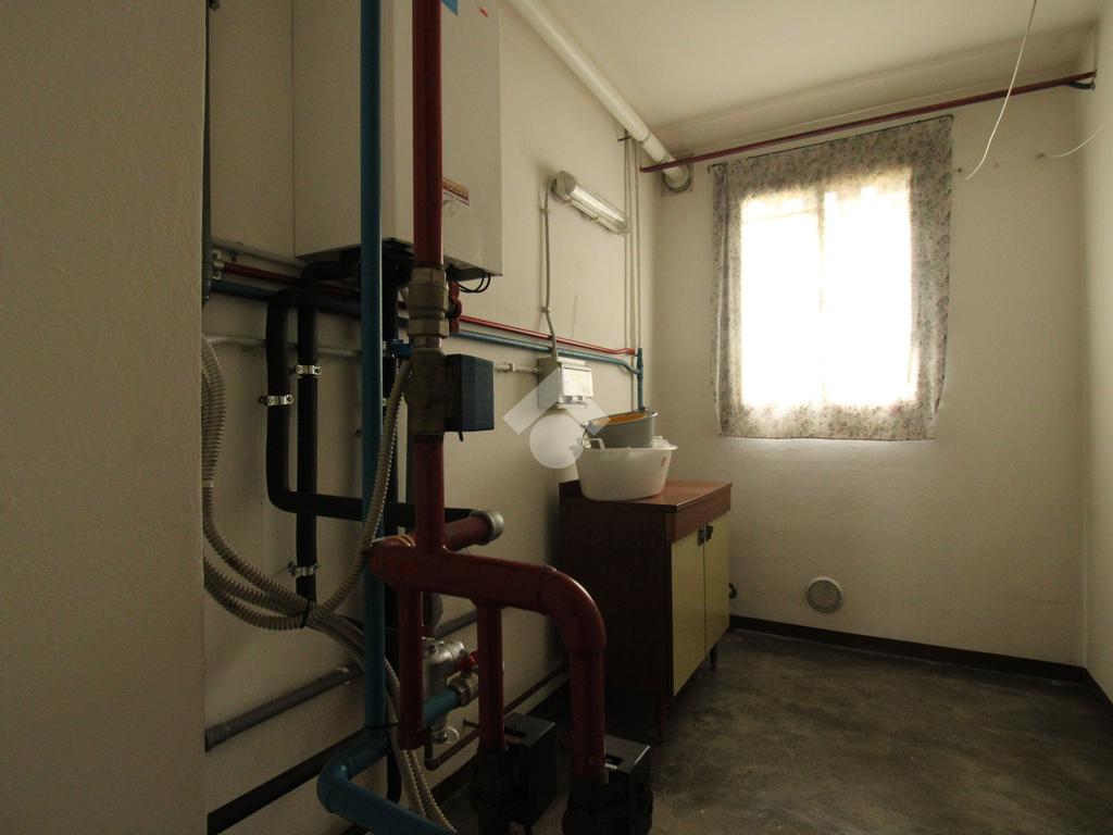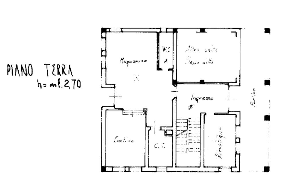 L'immobile, costruito all'inizio degli anni '70, propone un piano terra con altezza superiore ai 2.70 m, dove sono state ricavate una stanza adibita a studio o stireria, un bagno, un grande magazzino, dov'è presente una seconda entrata e la centrale termica. Oltre a ciò, è presente, scendendo circa 5 gradini, una cantina, dove si possono riporre salumi e vini.